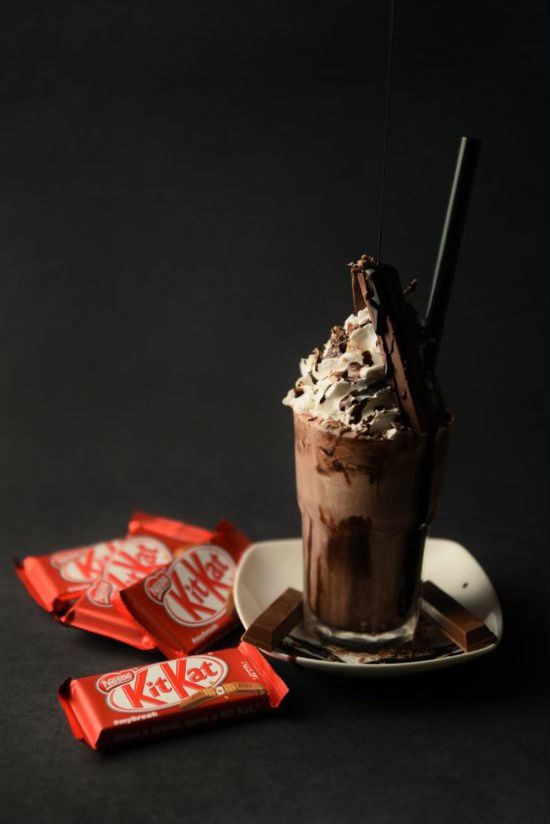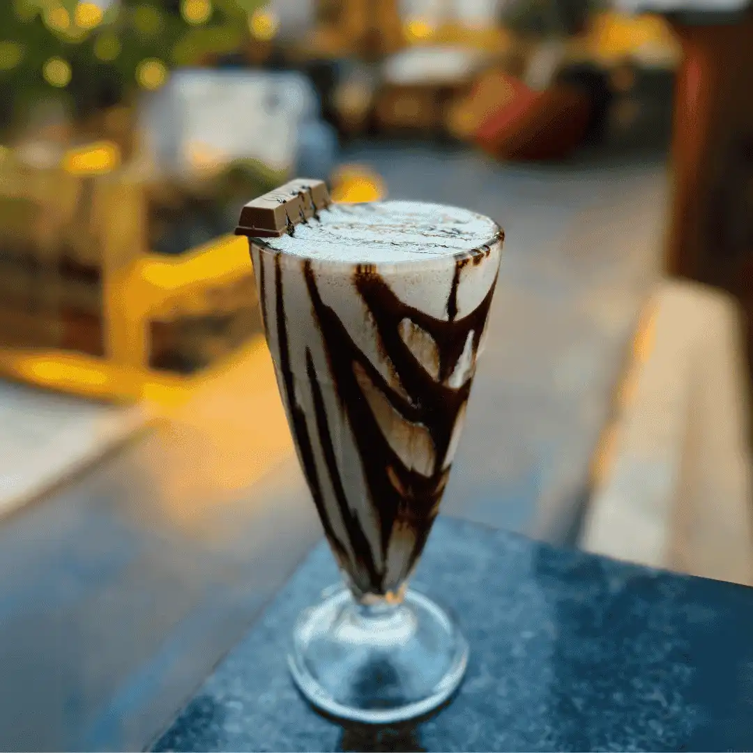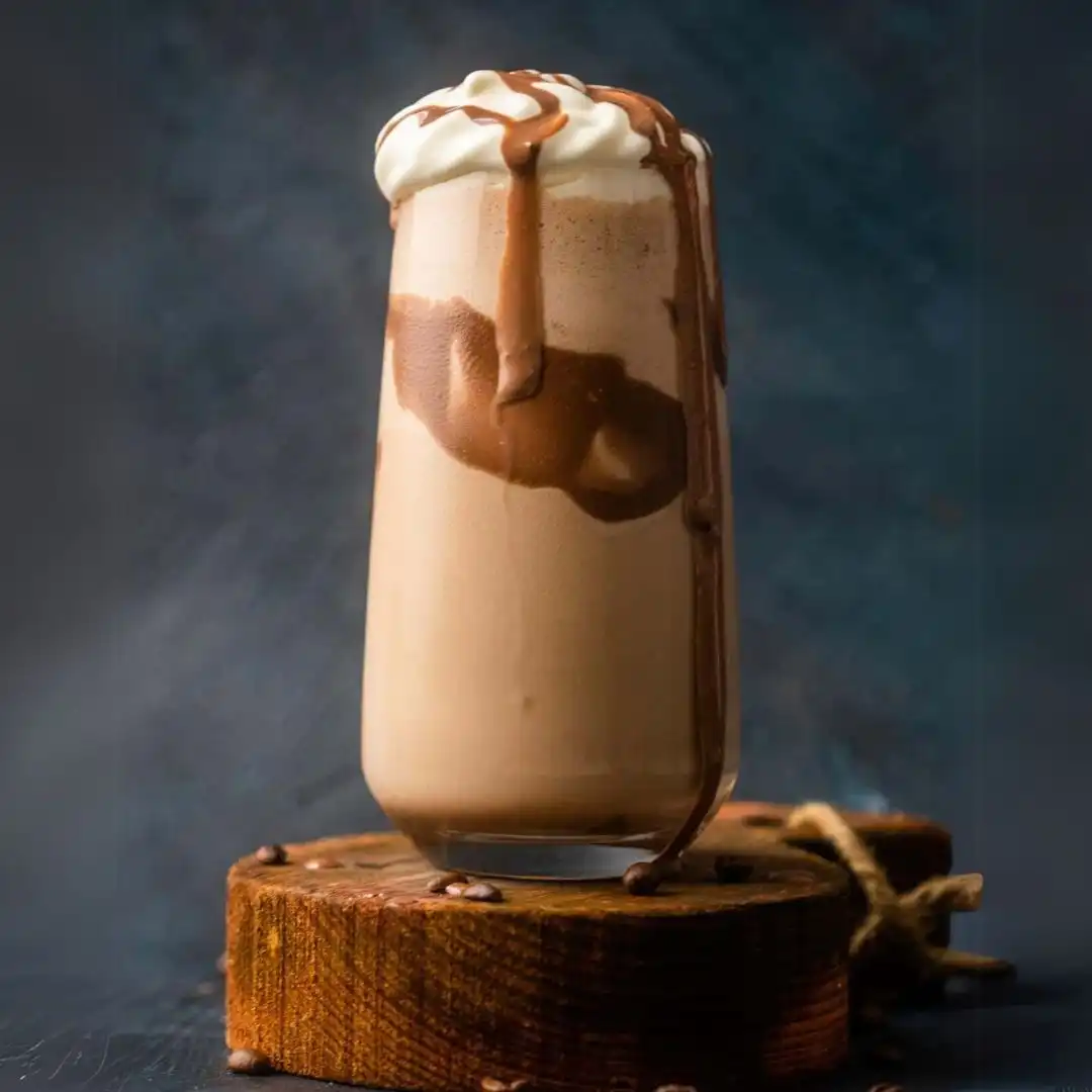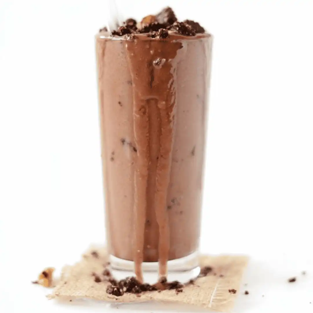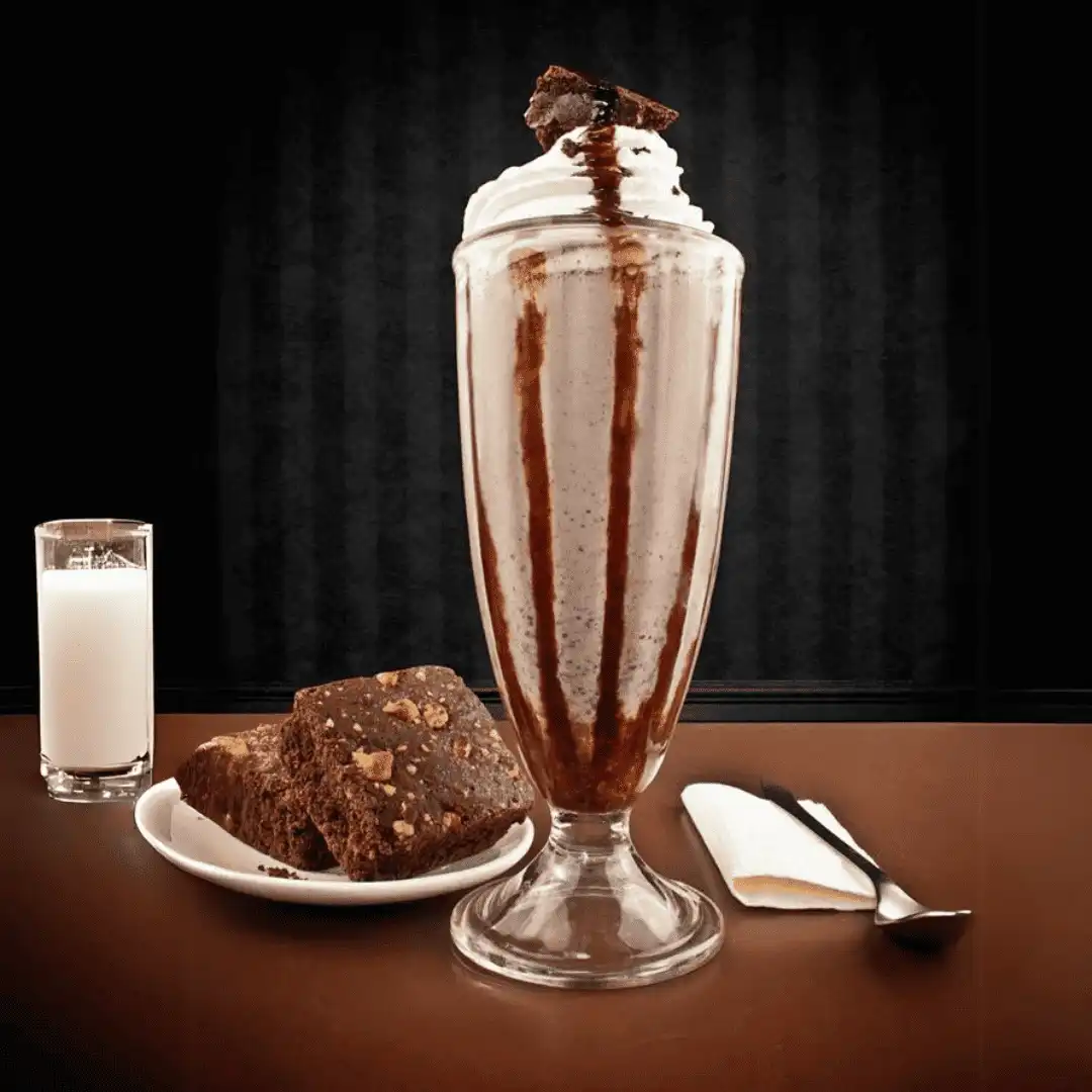 Thick milk shake with crushed fudge brownie topped with whipped cream