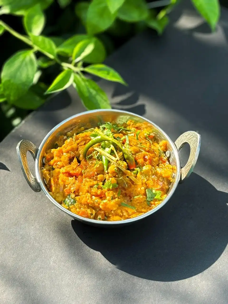 Char Grilled Eggplant cooked with Indian aromatics, best paired with Bajra Roti